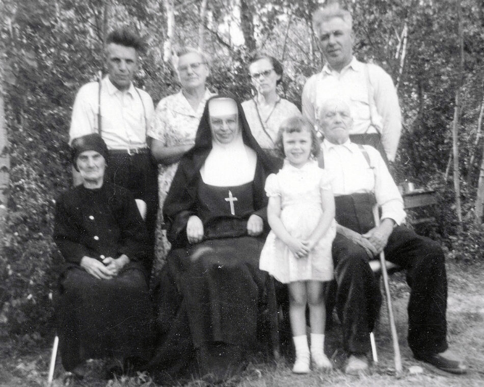 My Grandmother seated on the far left edge. My Grandfather seated on the far right edge. Stoic. The Nun in the center next to Gravel Roads. Circa 1959-60.
